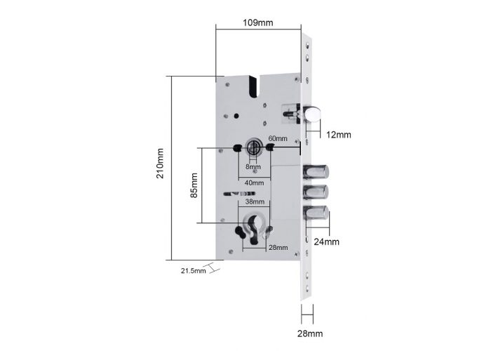 | Врезной механизм | 70 мм - бэксет (длина от края двери, до центра отвертия ручки) 85 мм - межосевое расстояние (длина от центра отвертия ручки, до ключевого отверстия) |